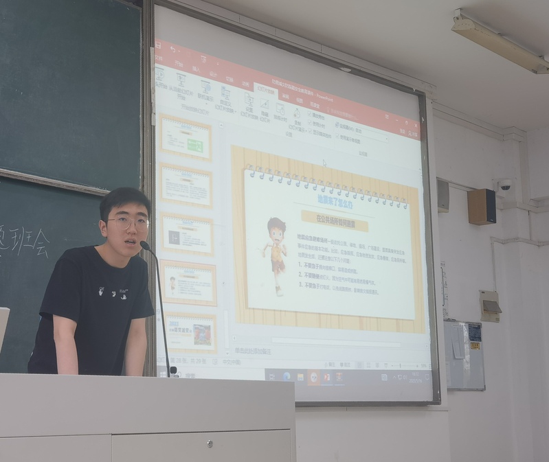 活动中,各班级班长、学习委员、班级安全员成立本次活动小组,向同学们系统地讲述了地震、火灾、洪水等几类灾害的形成原因、灾情特点、应急避险、灾后疏散等知识要点,并通过结合真实案例、观看应急避险视频的方式提高同学们面对灾害时的心理素质以及自救互救的能力。活动采取了互动提问、模拟逃生、现场指导的方式进行,使防灾减灾的意识和技能入脑、入心。最后,贾老师号召同学们防灾要从身边做起,例如及时排查宿舍火情隐患、注意寝室用电安全、严禁使用违章电器等,做到防患未然,平安常在。
