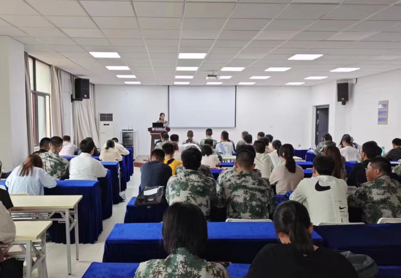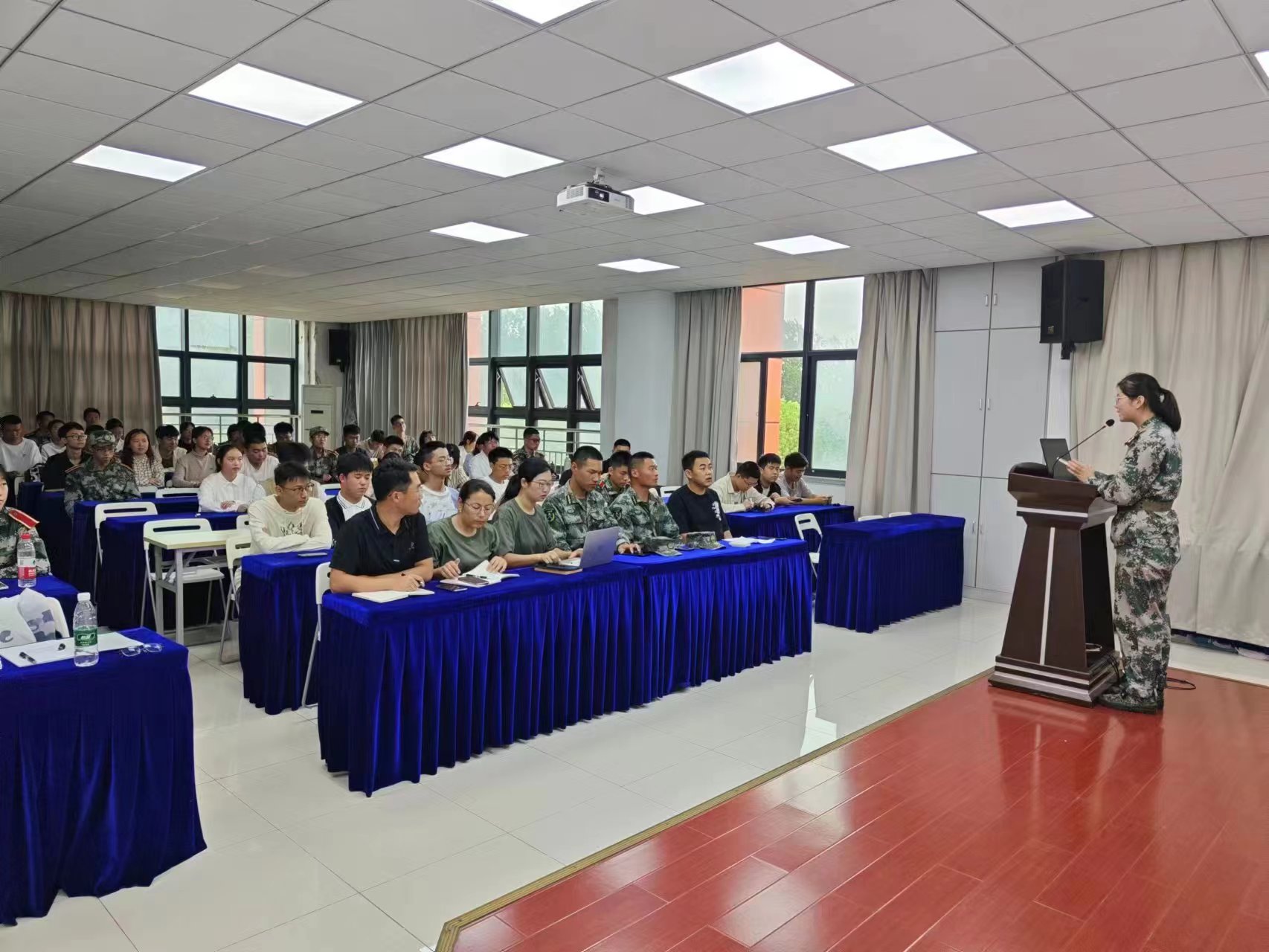 比赛伊始,辅导员老师给予选手们鼓励,缓解了现场比赛紧张的氛围,大家积极投入准备中。选手们在“振兴中华,强我国防”与“情系故土,爱我家乡”两个主题中任选其一,按照军训连队及班级学号的顺序依次上台演讲,为大家普及国防知识、开展国防教育,推介家乡好物、好景、好故事。参赛选手中,有同学曾有过丰富的演讲经历,也有同学表示此次比赛是自己迈出舒适圈的勇敢一步,每位选手演讲完毕,评委老师们都能够挖掘其演讲的闪光点,为选手找到合适的风格,给予勉励,送上寄语,引导大家关注后续话剧表演、迎新晚会、辩论赛等活动。