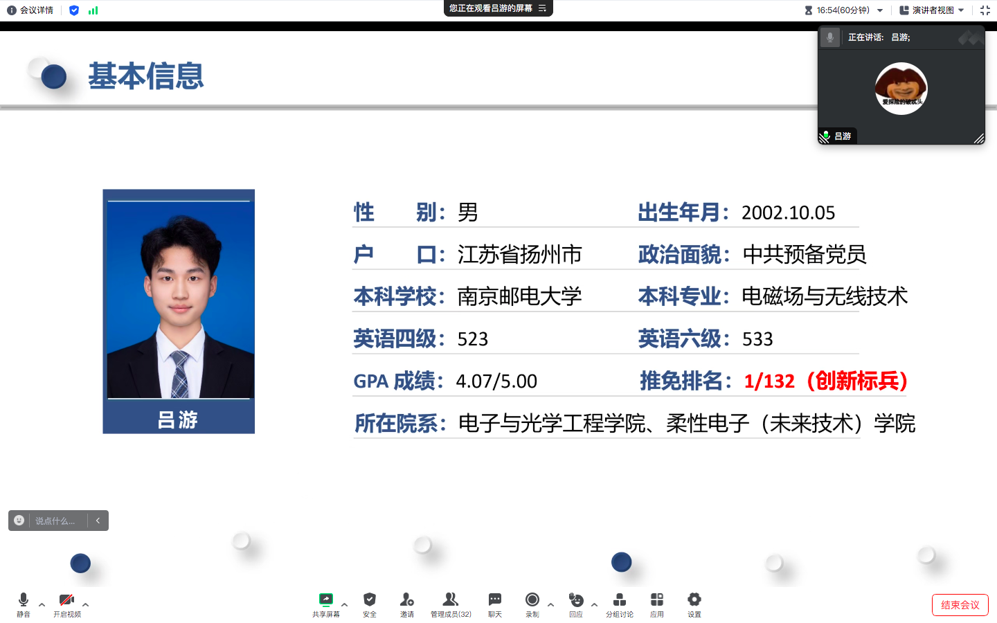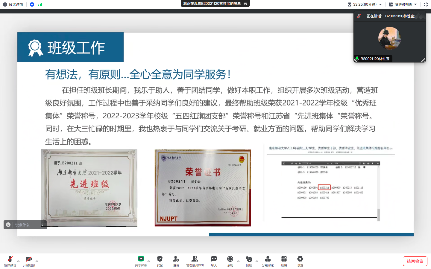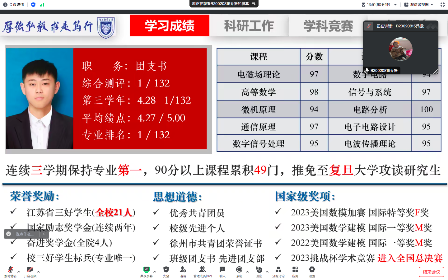 为树立典型,表彰先进,引导学生成为品德高尚、富有理想、快乐健康、积极向上、全面发展的新时代大学生,10月5日上午,tyc1286太阳成集团、柔性电子(未来技术)学院2020级电磁场与无线技术专业于线上开展了2022-2023学年“三好学生标兵” “三好学生”“优秀学生干部”公开答辩展示会,会议由辅导员肖俊桂老师主持。