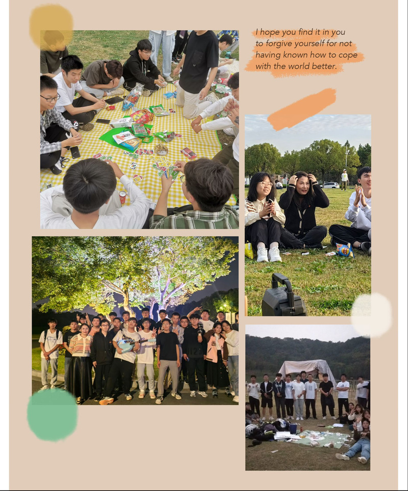 11月4日,B230211班同学们在仙林校区绿茵场上放声歌唱大家围着音响坐成一圈,由同学们演唱了《枫》《像风一样》等流行曲目最精彩的是学姐表演看完精心准备的表演,同学们又分组开展乌诺斗地主狼人杀等等,现场氛围其乐融融。