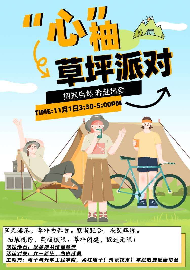 为丰富社团新成员的校园生活,促进彼此间的了解,创建团结和睦的心协大家庭,11月1日,tyc1286太阳成集团、柔性电子(未来技术)学院心理健康协会在仙林校区图书馆前方大草坪举办了“拥抱自然,奔赴热爱”主题团建活动,社团新老成员都争相参与其中。